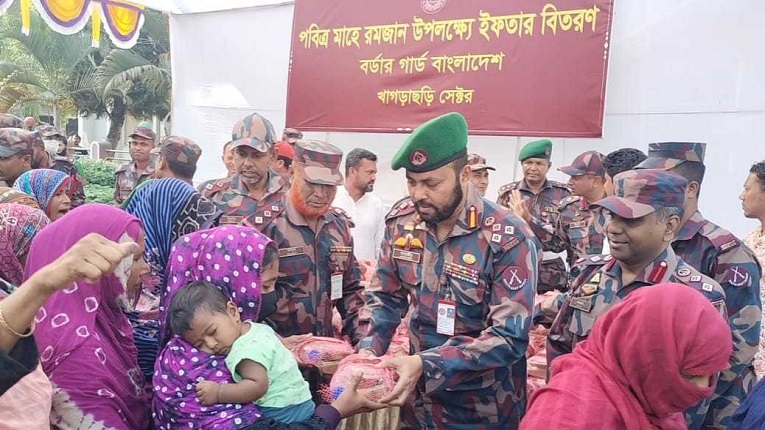 ল) বিকেল ৩টায় খাগড়াছড়ি সেক্টর কমান্ডার কর্নেল মোহাম্মদ জাহাঙ্গীর হোসেন বিজিবিএম পৌর ঈদগাহ প্রাঙ্গণে উপস্থিত থেকে ৯টি ওয়ার্ডের তিন হাজার গরীব জনসাধারণের মাঝে ইফতার ও রাতের খাবার বিতরণ করেন।আগামী ১৪ ও ১৫ এপ্রিল বাবুছড়া ৭ বিজিবি ব্যাটালিয়ন এবং মারিশ্যা ২৭ বিজিবি ব্যাটালিয়নের দায়িত্বপূর্ণ এলাকায় আরও দুই হাজার জনকে ইফতার ও রাতের খাবার বিতরণ করা হবে।