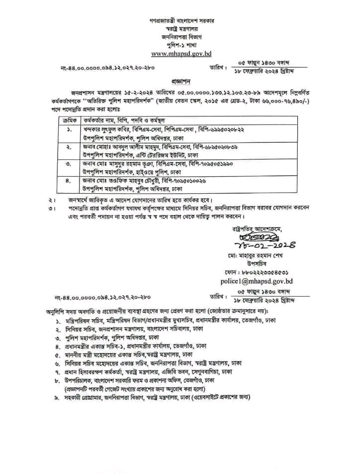 স্থায়ী পদে পদোন্নতিপ্রাপ্তরা হলেন পুলিশ অধিদপ্তরের উপমহাপরিদর্শক খন্দকার লুৎফুল কবির,ঢাকার অ্যান্টিটেররিজম ইউনিটের উপমহাপরিদর্শক মোহা. আবদুল আলীম মাহমুদ, ঢাকা হাইওয়ে পুলিশের উপমহাপরিদর্শক মো. মাসুদুর রহমান ভূঞা ও পুলিশ অধিদপ্তরের উপমহাপরিদর্শক মো. তওফিক মাহবুব চৌধুরী।