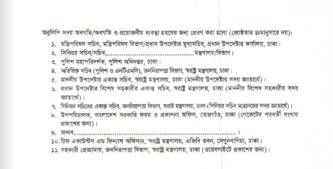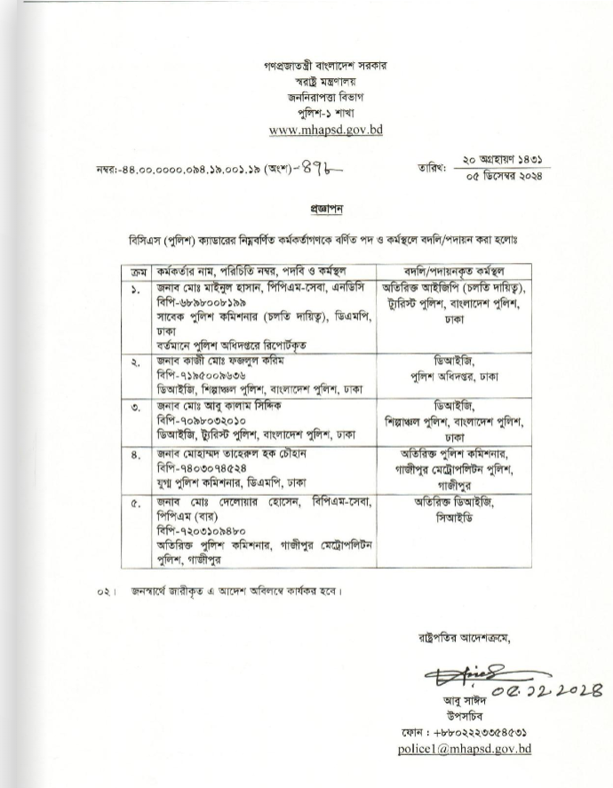 নিজস্ব প্রতিবেদক।।ঢাকা মহানগর পুলিশ (ডিএমপি)-সহ বাংলাদেশ পুলিশের ডিআইজি,অতিরিক্ত ডিআইজি, উপপুলিশ কমিশনার ও পুলিশ সুপার পদমর্যাদার ১৪ কর্মকর্তাকে বদলি/পদায়ন করা হয়েছে। বৃহস্পতিবার (৫ ডিসেম্বর) স্বরাষ্ট্র মন্ত্রণালয়ের জননিরাপত্তা বিভাগের পুলিশ-১ শাখা থেকে আলাদা তিনটি প্রজ্ঞাপনে এ বদলি করা হয়। রাষ্ট্রপতির আদেশক্রমে প্রজ্ঞাপনে সই করেন উপসচিব আবু সাঈদ। বদলি করা কর্মকর্তাদের তালিকা দেখতে এখানে ক্লিক করুন Post navigation বাংলাদেশে সন্ত্রাসী হামলার আশঙ্কায় যুক্তরাষ্ট্র এনআইডি হারিয়ে গেলে নতুন কার্ড তোলার ক্ষেত্রে থানায় জিডি করার বাধ্যবাধকতা থাকছে না-ইসি