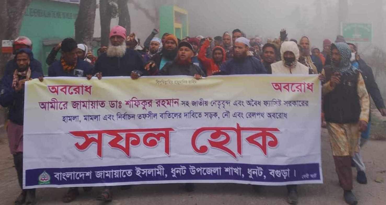 ধুনট (বগুড়া) প্রতিনিধি।।বগুড়ার ধুনট উপজেলা জামায়াতে ইসলামী অবরোধ কর্মসুচী পালন করেছে। জাতীয় নেতৃবৃন্দের উপর মামলা নির্যাতনের প্রতিবাদ ও নির্বাচনী তফসীল বাতিলের দাবিতে রবিবার এ কর্মসুচী পালিত পালিত হয়।র্যালী শেষে সংক্ষিপ্ত পথসভা করে জামায়াত।