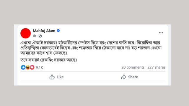 উপদেষ্টা মাহফুজ বলেন,এখনও ঐক্যই দরকার।হঠকারীদের স্পেইস দিলে বরং দেশের ক্ষতি হবে।বিরোধিতা আর প্রতিদ্বন্দ্বিতা কোনোভাবেই বিদ্বেষ এবং শত্রুতায় নিয়ে ঠেকানো যাবে না।বড় শয়তান এখনও আমাদের কাঁধে শ্বাস ফেলছে।’