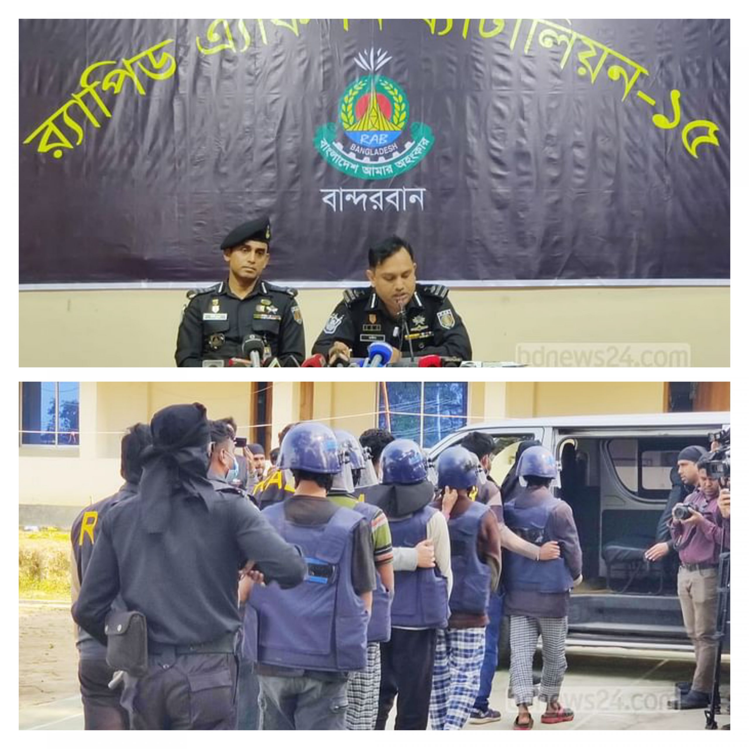 বৃহস্পতিবার সকালে বান্দরবান জেলা পরিষদের কনফারেন্স রুমে সংবাদ সম্মেলনে র্যাব জানায়,গ্রেপ্তারকৃতদের মধ্যে সালেহ আহমেদ,সাদিকুর রহমান ও কুমিল্লার এক কিশোরকে থানচি এবং বায়েজিদ ও নিজামুদ্দিন হিরণকে রোয়াংছড়ি উপজেলার দুর্গম এলাকা থেকে গ্রেপ্তার করা হয়েছে।তবে তাদের কাছ থেকে কোনো অস্ত্র পাওয়া যায়নি।