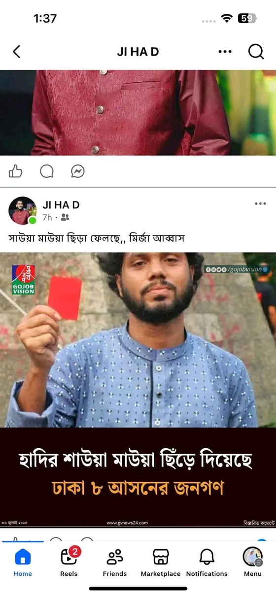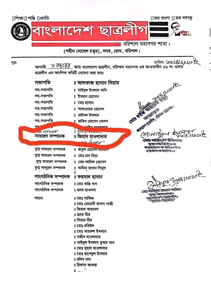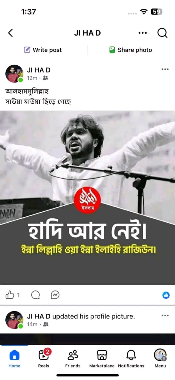 নিজস্ব প্রতিবেদক।।বরিশালের ২৬ নম্বর ওয়ার্ড ছাত্রলীগের সাধারণ সম্পাদক,যিনি টিকটক তারকা মাহিয়া মাহির জামাই হিসেবে পরিচিত,সামাজিক মাধ্যমে প্রকাশ্যভাবে হাদির মৃত্যুকে উদযাপন করে ‘আলহামদুলিল্লাহ’ পোস্ট করেছেন।এই ঘৃণ্য ও অসহনীয় মন্তব্য এলাকার মানুষকে হতবাক করেছে এবং নিন্দার ঝড় তুলেছে।
