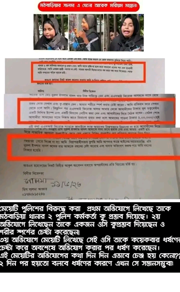 এবিষয়ে অভিযোগকারী সালমা বেগম (সালমা আক্তার) কাছে তার ঘটনার স্বপক্ষে—–জানতে চাইলেও দীর্ঘ আড়াই মাস অসুস্থ বলে এড়িয়ে যান।সিআইডির ফরসনিক রিপোর্টে কাবিন রেজিস্ট্রারের সহি/স্বাক্ষর মিলছে এটা সঠিক কিনা!কাবিনের স্বাক্ষর তার স্বীকার করে বলেন,এএসআই ফিরোজ আলম ভুল বুঝিয়ে নিয়েছে।তিনি টাকার বিনিময়ে প্রতিবেদকে ম্যানেজ করার চেষ্টা করেন।আবার শারীরিক সম্পর্কের বিনিময়ে হলেও তার বিরুদ্ধে সংবাদ প্রকাশ না করতে বলেন।এছাড়া পুলিশের বিরুদ্ধে ক্ষোভে অভিমানে অভিযোগ করেছেন কিনা প্রশ্ন করা হলে,অকথ্য ভাষায় গালিগালাজ করে হুমকি প্রদর্শন করে বলেন,আমার বিরুদ্ধে কোনো নিউজ করলে মামলা করবো।