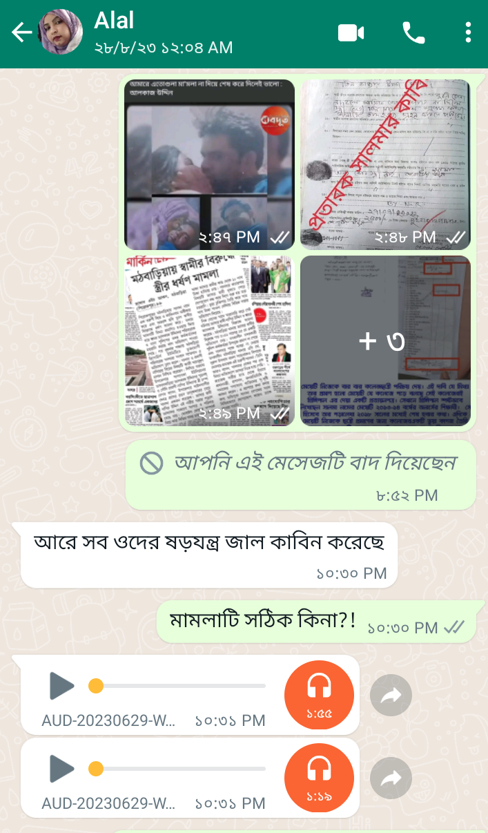 নাসির উদ্দিন আরও উল্লেখ করেন,আমি একজন সৌদি প্রবাসী। সে সুবাদে আমার সাথে হোয়াটসঅ্যাপে কুট-কৌশলে সম্পর্কের পর যৌন উত্তেজনা মুলক ভিডিও কল করতেন। ভিডিও কলে সেক্স করার পর বিয়ের প্রস্তাব দিয়েছেন। আমি হোয়াটসঅ্যাপে বিয়ে করতে রাজি হই।কৌশলে বিয়ে সম্পূর্ণ হলে গত ৪ বছরে জমি ক্রয়- সোনার অলংকার ক্রয় বিভিন্ন অজুহাতে লাখ লাখ টাকা হাতিয়ে নিয়েছে। তবুও বিভিন্ন উঠতি বয়সী তরুণদের সঙ্গে অনৈতিক কর্মকাণ্ড করে বেড়ায়। বিভিন্ন লোকের মাধ্যমে অবগত হয়ে বারণ করেছি। তবুও ক্ষ্যান্ত হয়নি। এরপর দেশে ফিরে আসার পর কোর্ট ম্যারেজ করছি। আমার সাথে বিশ্বাসঘাতকতা করে, আমার সাথে অন্তরঙ্গ মুহূর্তের ভিডিও চিত্রধারণ করে বিয়ে অস্বীকার করে প্রথমে ৭লাখ টাকা দাবি করেছেন।পরে মঠবাড়িয়া থানায় ধর্ষণের অভিযোগে মামলা দায়ের করেন। পুলিশের কাছে বিয়ের হলফনামা দেখালেও তারা পূর্নরায় কাবিন রেজিস্ট্রারী বিয়ে করতে হবে বলায় কাজী মাহমুদ হাসানকে থানায় ডেকে এনে বিয়ে সম্পন্ন করা হয়েছে।উক্ত বিয়েও অস্বীকার করায় আদালতের বিচারক কাবিননামার সত্যতা যাচাইয়ের জন্য সিআইডির ফরসনিক ল্যাবটারীতে পরীক্ষা পূর্বক রিপোর্ট প্রদানের নির্দেশ দেন। সিআইডির ফরসনিক রিপোর্টে কাবিন রেজিস্ট্রারের সহি/স্বাক্ষর সালমার প্রমানিত হয়েছে। সালমার বিরুদ্ধে আদালতে যৌতুক ও প্রতারনার অভিযোগে মামলা দায়ের করি।