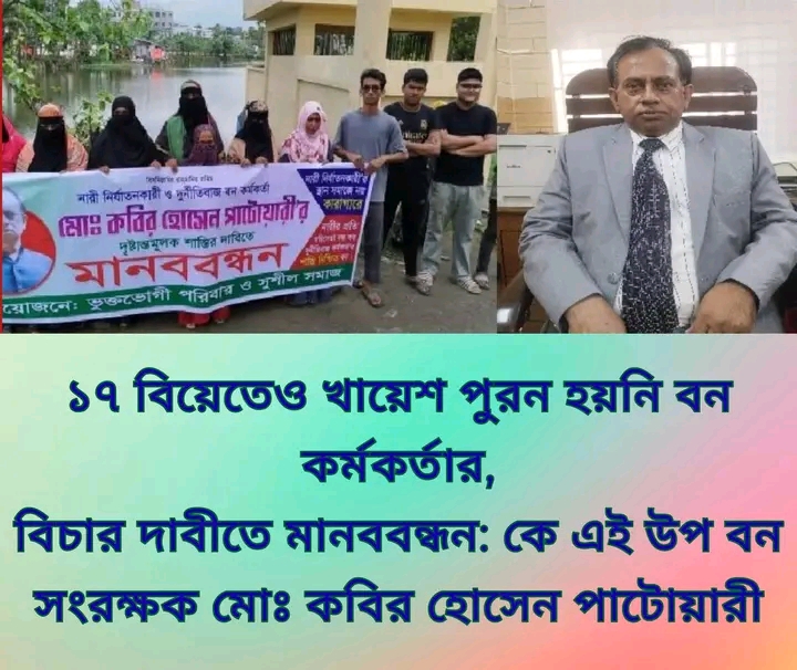 উল্লেখ্য,বরিশাল বিভাগীয় বন কর্মকর্তা (ডিএফও) মো. কবির হোসেন পাটোয়ারী ১৭ জন নারীকে বিয়ে করার অভিযোগে ও তার বিচারের দাবীতে ভুক্তভোগী পরিবার ও সুশীল সমাজের ব্যানারে বৃহস্পতিবার (১১ সেপ্টেম্বর) বরিশাল নগরীর কাশিপুর বন সংরক্ষক কার্যালয়ের সামনে ঘন্টাব্যাপী মানববন্ধন করা হয়।এসময় ঢাকার বাসিন্দা নাজনিন আক্তার শীলা,নারায়ণগঞ্জের সোনিয়া,খুলনার নাসরিন আক্তার দোলনসহ ১৭ জন নারী তার প্রতারণার শিকার হয়েছেন বলে দাবী করেন তারা।মানববন্ধনে অংশ নেওয়া স্ত্রীরা বলেন,সব শেষ খুলনার চাকরিজীবী খাদিজা আক্তারকে চলতি বছরের ১৪ ফেব্রুয়ারি বিয়ে করেন বন কর্মকর্তা মো : কবির।বিয়ের দ্বিতীয় দিনেই স্ত্রীর বাবার বাড়ির অংশ লিখে দেয়ার জন চাপ প্রয়োগ করেন কবির হোসেন।