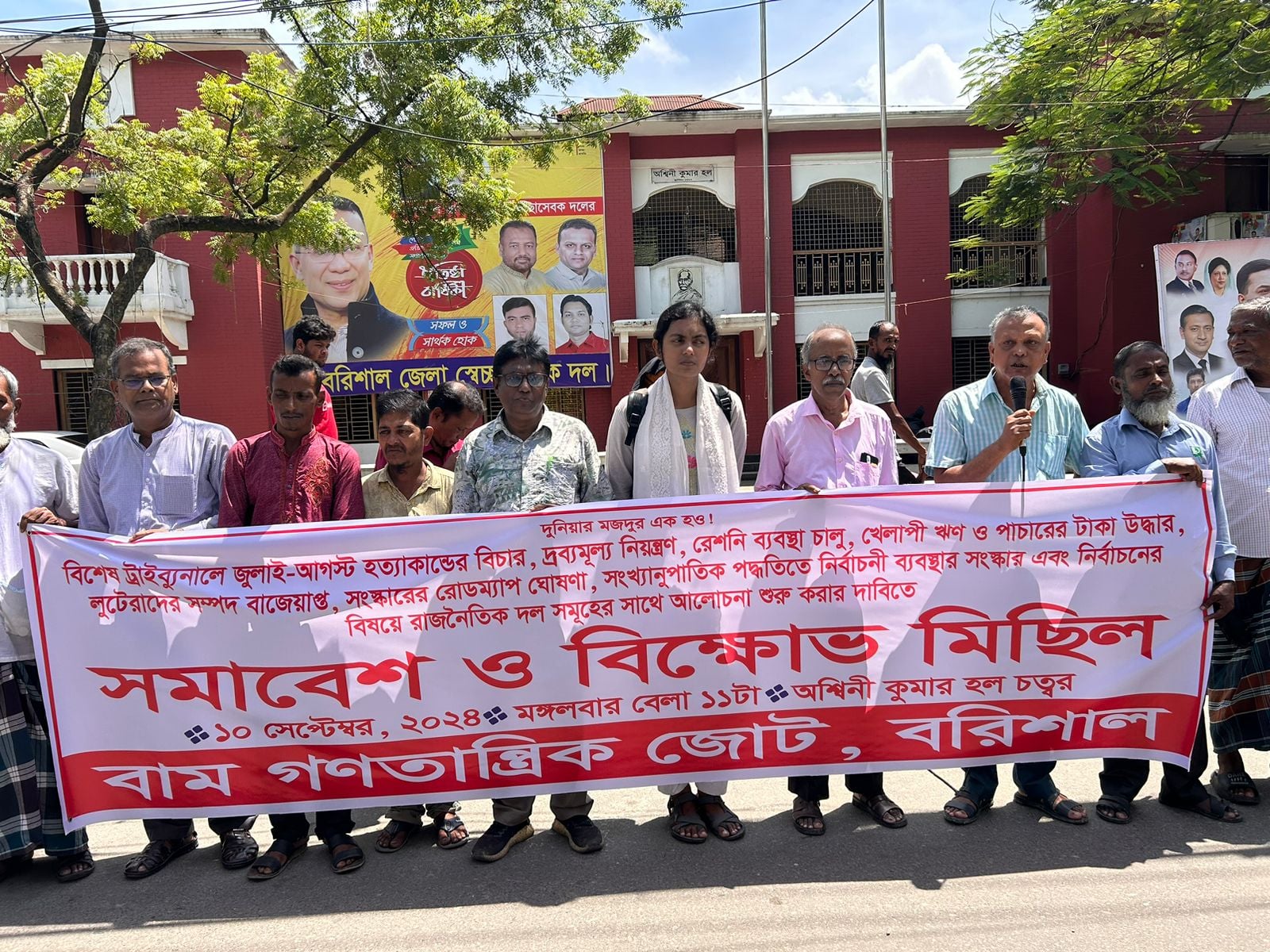 বাম গণতান্ত্রিক জোট বরিশাল জেলা শাখার সংগঠক নৃপেন্দ্রনাথ বাড়ৈর সভাপতিত্বে বক্তারা বলেন,জুলাই অভ্যুত্থানের এক মাস পার হয়ে গেলেও স্বৈরাচারী সরকার পরিচালিত হত্যাকাণ্ডে নিহত সহস্রাধিক শহিদি জনতা হত্যার সুষ্ঠু বিচার হচ্ছেনা।গণহত্যার বিচারে রাষ্ট্রীয় উদ্যোগে বিশেষ ট্রাইব্যুনাল গঠন করে বিচারিক প্রক্রিয়া শুরু না করে আগের সরকারের স্টাইলে গণহারে মামলা দেয়া হচ্ছে।গণহারে মামলা করলেই গণহত্যার বিচার নিশ্চিত করা যায় না।