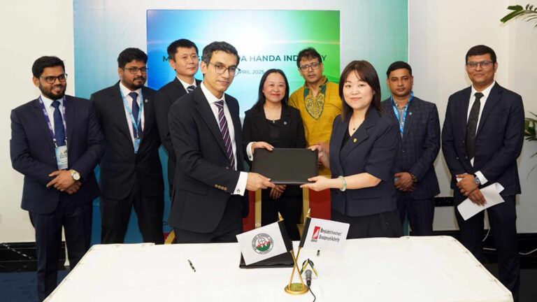 নিজস্ব প্রতিবেদক।।এবার বাংলাদেশে ১৫০ মিলিয়ন মার্কিন ডলার বিনিয়োগ করতে যাচ্ছে চীনভিত্তিক খ্যাতনামা পোশাক প্রস্তুতকারক প্রতিষ্ঠান হানডা ইন্ডাস্ট্রিজ লিমিটেড। বুধবার (৯ এপ্রিল) রাজধানীর একটি হোটেলে বাংলাদেশ বিনিয়োগ উন্নয়ন কর্তৃপক্ষ (বিডা) ও বাংলাদেশ অর্থনৈতিক অঞ্চল কর্তৃপক্ষের (বেজা) নির্বাহী চেয়ারম্যান চৌধুরী আশিক মাহমুদ বিন হারুন এবং হানডা (ঢাকা) টেক্সটাইল কোম্পানি লিমিটেডের চেয়ারম্যান হেং জেলি নিজ নিজ প্রতিষ্ঠানের পক্ষ থেকে এ বিষয়ে একটি সমঝোতা স্মারক স্বাক্ষর করেন। সমঝোতা স্মারক স্বাক্ষর করছেন চৌধুরী আশিক মাহমুদ বিন হারুন এবং হেং জেলি। চীনা প্রতিষ্ঠান হানডা ইন্ডাস্ট্রিজ বিশ্বব্যাপী উন্নতমানের নিট কাপড়,রঙ প্রক্রিয়াজাতকরণ এবং পোশাক উৎপাদনে বিশেষজ্ঞ। তারা বাংলাদেশের অর্থনৈতিক অঞ্চলের আওতায় বস্ত্র ও রঙ প্রক্রিয়াজাতকরণ খাতে ১০০ মিলিয়ন ডলার এবং রফতানি প্রক্রিয়াকরণ অঞ্চলের আওতায় পোশাক শিল্পে ৫০ মিলিয়ন ডলার বিনিয়োগ করবে। উল্লেখ্য,৭ এপ্রিল চার দিনব্যাপী বিনিয়োগ সম্মেলন শুরু হয় বাংলাদেশে।বিদেশি বিনিয়োগের ক্ষেত্রে পুরানো ধারণা ভাঙতেই এ বিনিয়োগ সম্মেলন।এতে অংশ নিয়েছে ৪০ দেশের ছয় শতাধিক বিনিয়োগকারী।সম্মেলনের প্রথমদিন অনুষ্ঠিত হয় প্লেনারি সেশন।যাতে দীর্ঘমেয়াদী ট্রেড লাইসেন্স ইস্যুর কথা তুলে ধরা হয়। তাছাড়া প্রথম দুইদিন বিদেশি বিনিয়োগকারীরা ঢাকার বাইরের বিশেষ অর্থনৈতিক অঞ্চল পরিদর্শন করেন।৭ এপ্রিল চট্টগ্রামের মিরসরাইয়ে জাতীয় অর্থনৈতিক অঞ্চল এবং ৮ এপ্রিল নারায়ণগঞ্জের আড়াইহাজারে জাপানের অর্থনৈতিক অঞ্চল পরিদর্শন করেন তারা। Post navigation কাতার সফরে যাচ্ছেন-মুহাম্মদ ইউনূস জাতীয় নিরাপত্তা উপদেষ্টা এবং রোহিঙ্গা সমস্যাবিষয়ক হাই রিপ্রেজেন্টেটিভ’ হলেন-খলিলুর রহমান