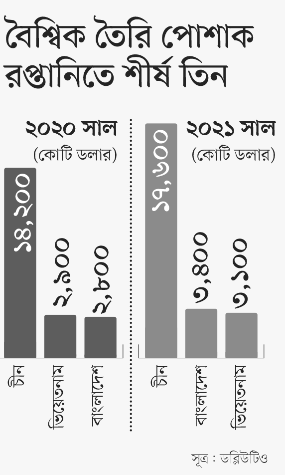 ডব্লিউটিওর তথ্যানুযায়ী,চীন গত বছর ১৭ হাজার ৬০০ কোটি ডলারের তৈরি পোশাক রপ্তানি করেছে।২০২০ সালে তাদের রপ্তানি ছিল ১৪ হাজার ২০০ কোটি ডলারের।ফলে বৈশ্বিক পোশাক রপ্তানিতে চীনের হিস্যা ৩১ দশমিক ৬ শতাংশ থেকে বেড়ে গত বছর ৩২ দশমিক ৮ শতাংশ হয়েছে।