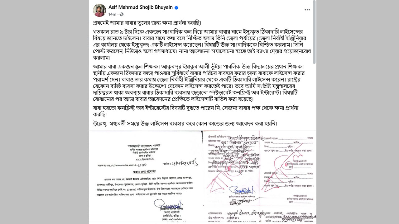 ‘প্রথমেই আমার বাবার ভুলের জন্য ক্ষমা প্রার্থনা করছি। গতকাল রাত ৯ টার দিকে একজন সাংবাদিক কল দিয়ে আমার বাবার নামে ইস্যুকৃত ঠিকাদারি লাইসেন্সের বিষয়ে জানতে চান। বাবার সাথে কথা বলে নিশ্চিত হলাম তিনি জেলা পর্যায়ের (জেলা নির্বাহী ইঞ্জিনিয়ার এর কার্যালয় থেকে ইস্যুকৃত) একটি লাইসেন্স করেছেন।বিষয়টি উক্ত সাংবাদিককে নিশ্চিত করলাম। তিনি পোস্ট করলেন, নিউজও হলো গণমাধ্যমে। নানা আলোচনা-সমালোচনা হচ্ছে, তাই ব্যাখ্যা দেওয়ার প্রয়োজন বোধ করলাম।