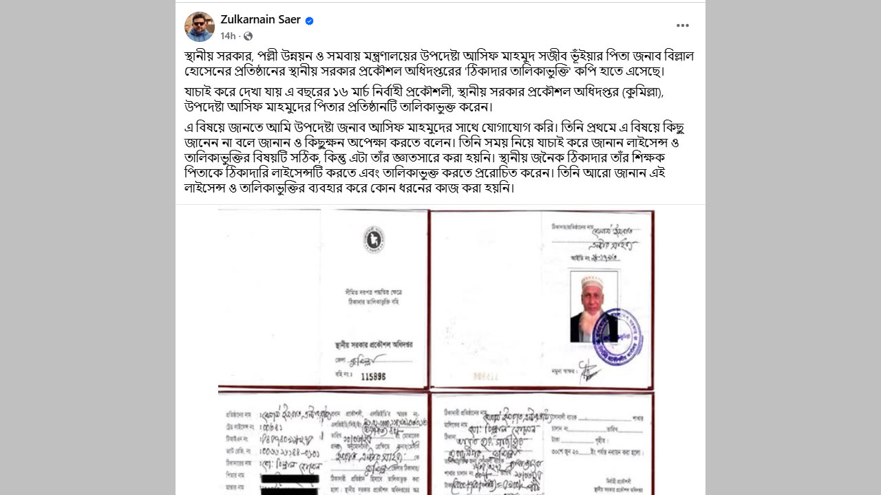 বিষয়টি নিয়ে গতকাল রাতে ফেসবুকে একটি স্ট্যাটাস দিয়েছিলেন আলজাজিরার সাংবাদিক জুলকারনাইন সায়ের। এতে তিনি লেখেন— স্থানীয় সরকার, পল্লী উন্নয়ন ও সমবায় মন্ত্রণালয়ের উপদেষ্টা আসিফ মাহমুদ সজীব ভূঁইয়ার পিতা জনাব বিল্লাল হোসেনের প্রতিষ্ঠানের স্থানীয় সরকার প্রকৌশল অধিদপ্তরের ‘ঠিকাদার তালিকাভুক্তি’র কপি হাতে এসেছে।