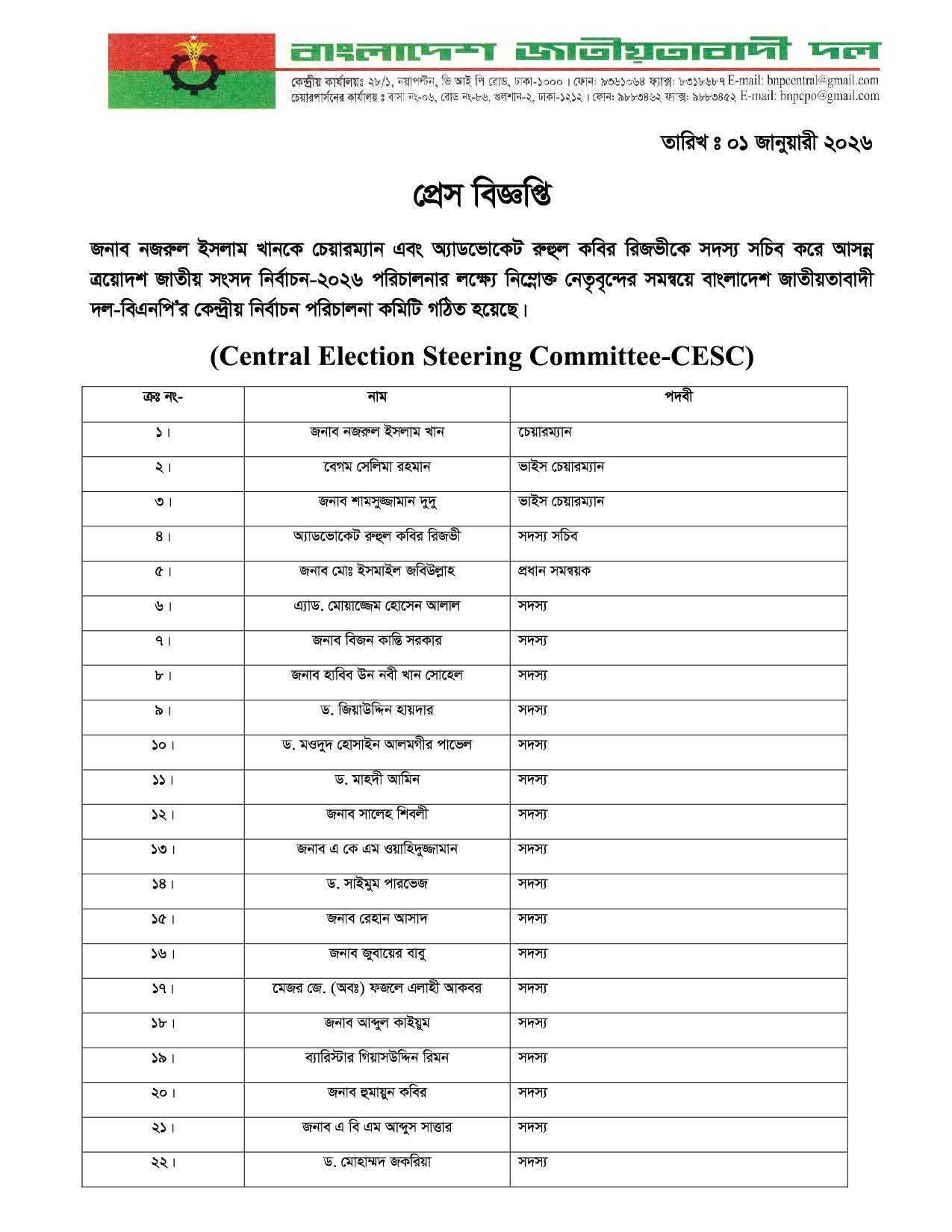 নিজস্ব প্রতিবেদক।।বাংলাদেশ জাতীয়তাবাদী দল-বিএনপি আসন্ন ত্রয়োদশ জাতীয় সংসদ নির্বাচন-২০২৬ পরিচালনার জন্য নতুন কেন্দ্রীয় নির্বাচন পরিচালনা কমিটি (Central Election Steering Committee-CESC) গঠন করেছে।