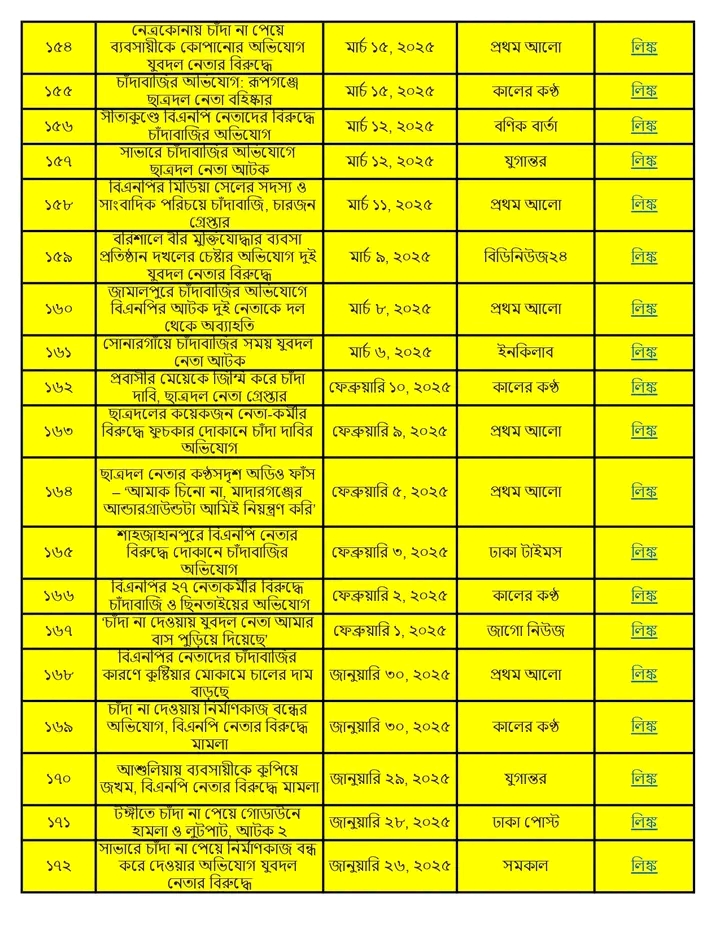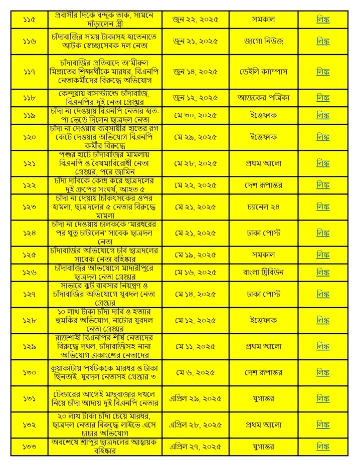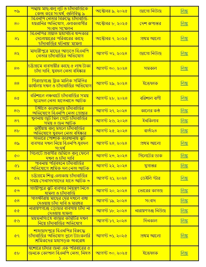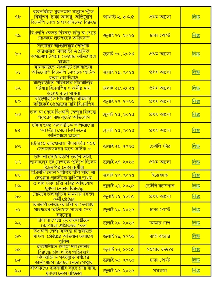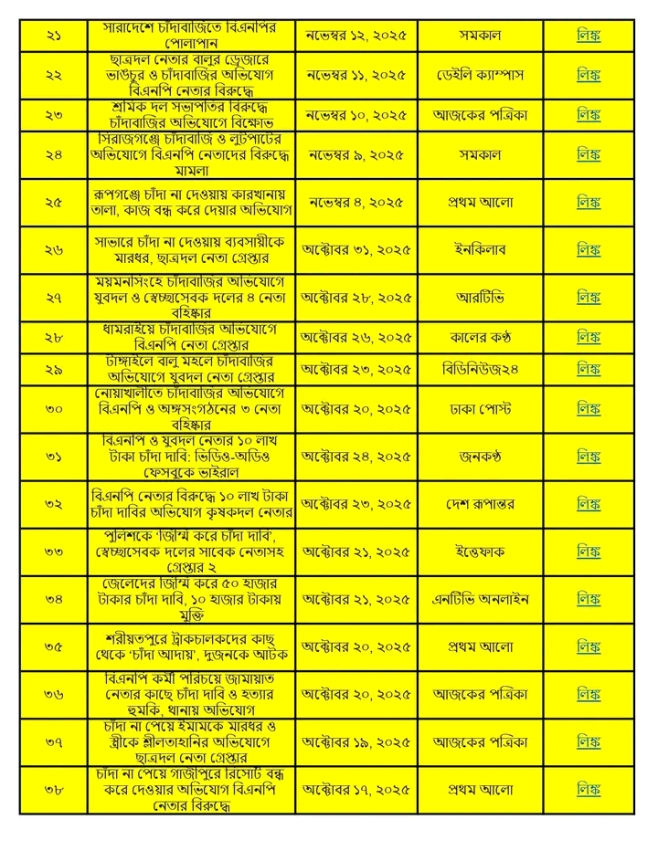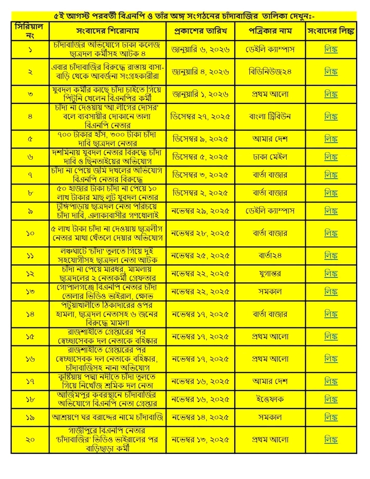 অনুসন্ধানী রিপোর্ট:৫ আগস্ট ২০২৪ থেকে ১৩ জানুয়ারি ২০২৬ পর্যন্ত দেশের বিভিন্ন অঞ্চলে বিএনপি ও তার অঙ্গসংগঠনের নেতাকর্মীরা চাঁদাবাজি, হুমকি, ব্যবসা দখল এবং সামাজিক নিরাপত্তা ক্ষুণ্ণ করার কর্মকাণ্ডে সক্রিয় ছিল। এই প্রতিবেদনে ১৭ মাসের আড়াই শতাধিক ঘটনার বিশ্লেষণ করা হয়েছে।