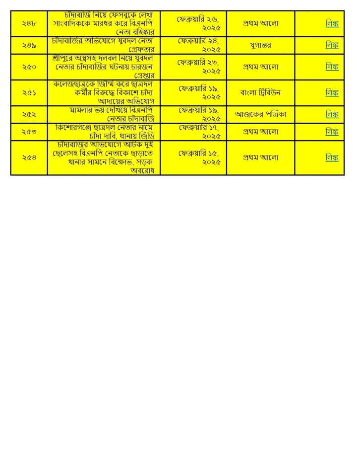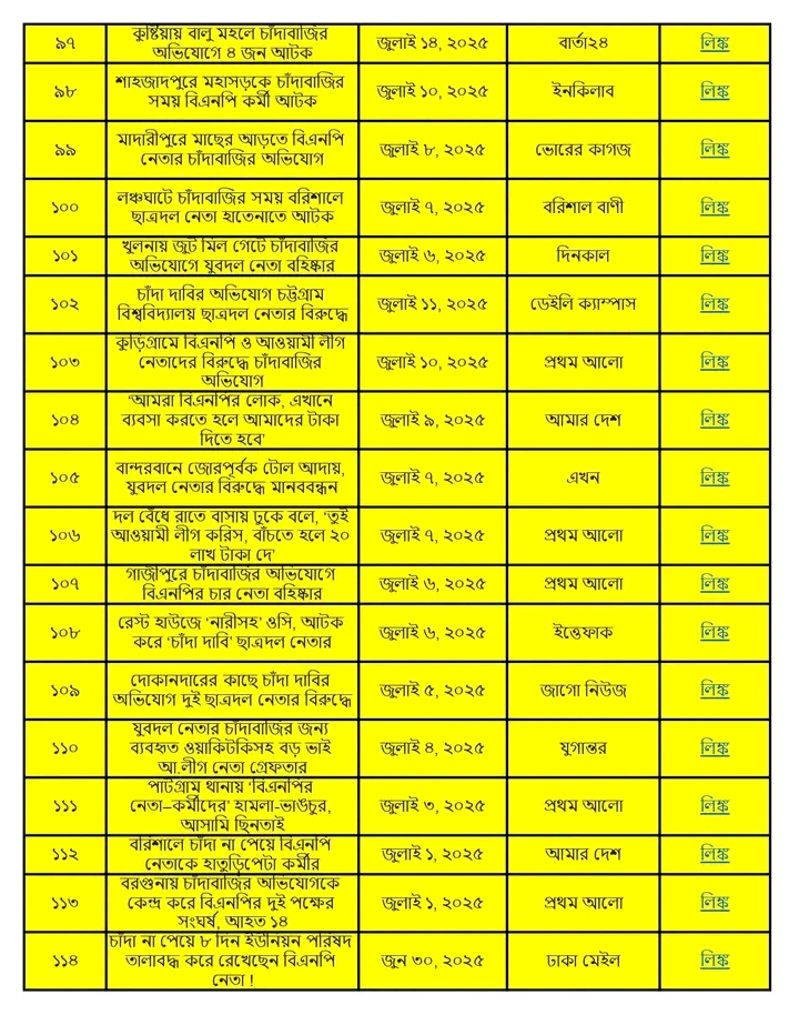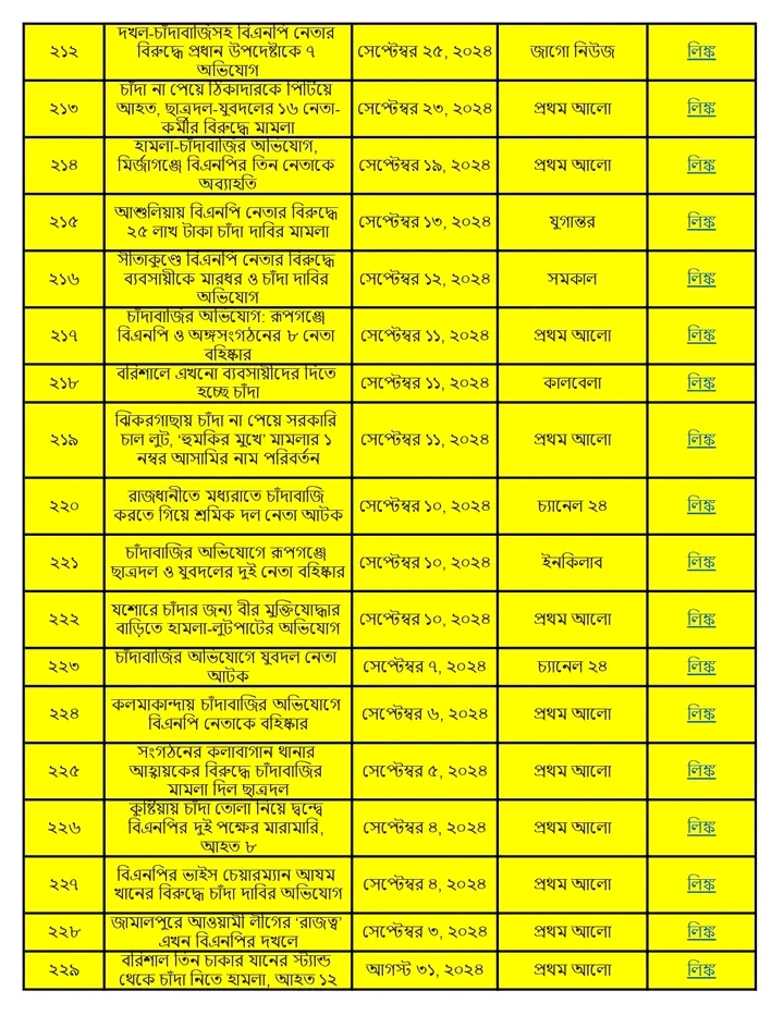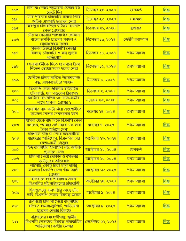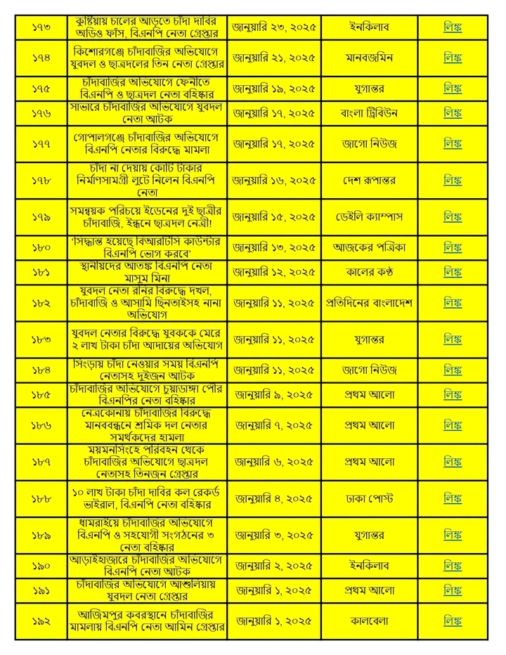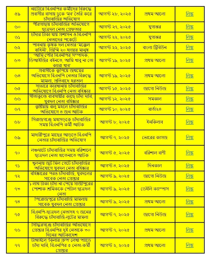 অনুসন্ধানী রিপোর্ট:৫ আগস্ট ২০২৪ থেকে ১৩ জানুয়ারি ২০২৬ পর্যন্ত দেশের বিভিন্ন অঞ্চলে বিএনপি ও তার অঙ্গসংগঠনের নেতাকর্মীরা চাঁদাবাজি, হুমকি, ব্যবসা দখল এবং সামাজিক নিরাপত্তা ক্ষুণ্ণ করার কর্মকাণ্ডে সক্রিয় ছিল। এই প্রতিবেদনে ১৭ মাসের আড়াই শতাধিক ঘটনার বিশ্লেষণ করা হয়েছে।