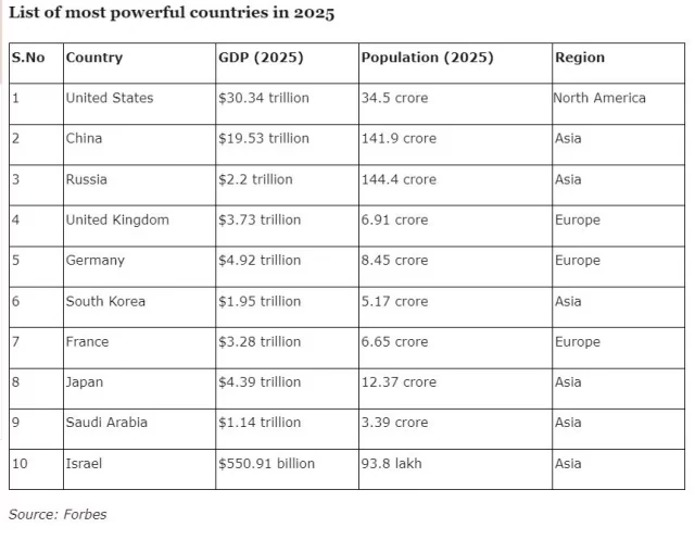 অনলাইন ডেস্ক রিপোর্ট।।২০২৫ সালে বিশ্বের সবচেয়ে শক্তিধর ১০টি দেশের তালিকা প্রকাশ করেছে মার্কিন সাময়িকী ফোর্বস।এই তালিকার শীর্ষে রয়েছে যুক্তরাষ্ট্র।পাঁচ নম্বরে স্থান পেয়েছে ইউরোপের দেশ জার্মানি।