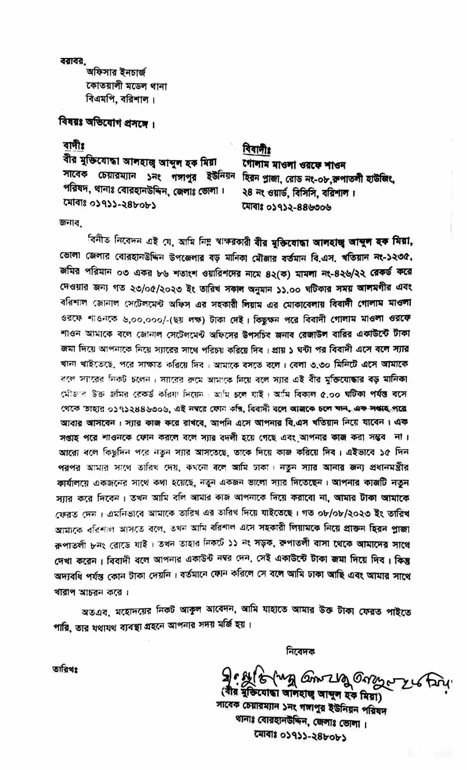 ভুক্তভোগী আরও জানান,তিনি বিষয়টি নিয়ে পুলিশ কমিশনার,জেলা পুলিশ সুপার বরিশাল এবং পিবিআই-এর ডিআইজি বরাবরও লিখিত অভিযোগ দাখিল করেছেন।