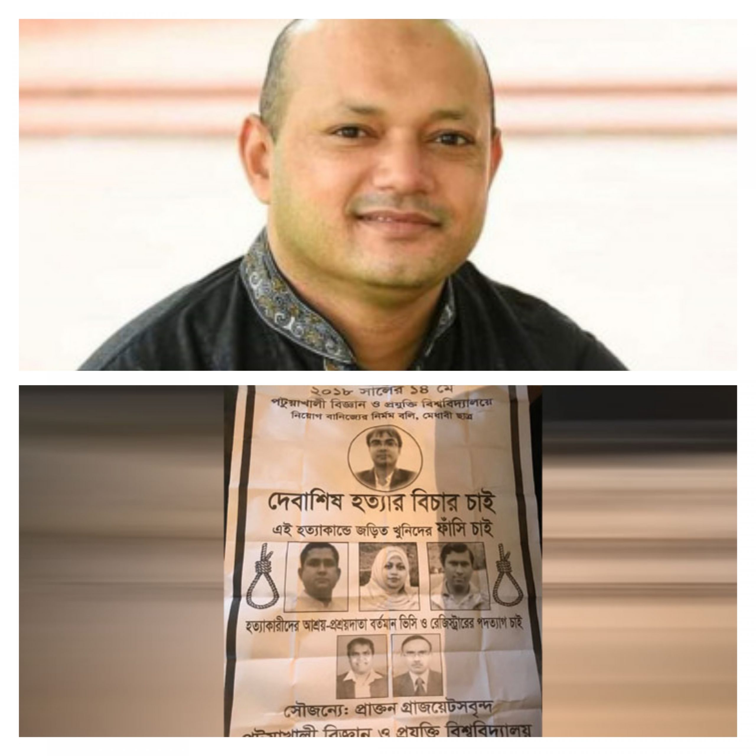 পোস্টারে দাবি করা হয়, ‘২০১৮ সালের ১৪ মে বিশ্ববিদ্যালয়ের মেধাবী শিক্ষার্থী দেবাশীষ এই বিশ্ববিদ্যালয়ে শিক্ষক হিসেবে নিয়োগ না পাওয়ায় আত্মহত্যা করেন।