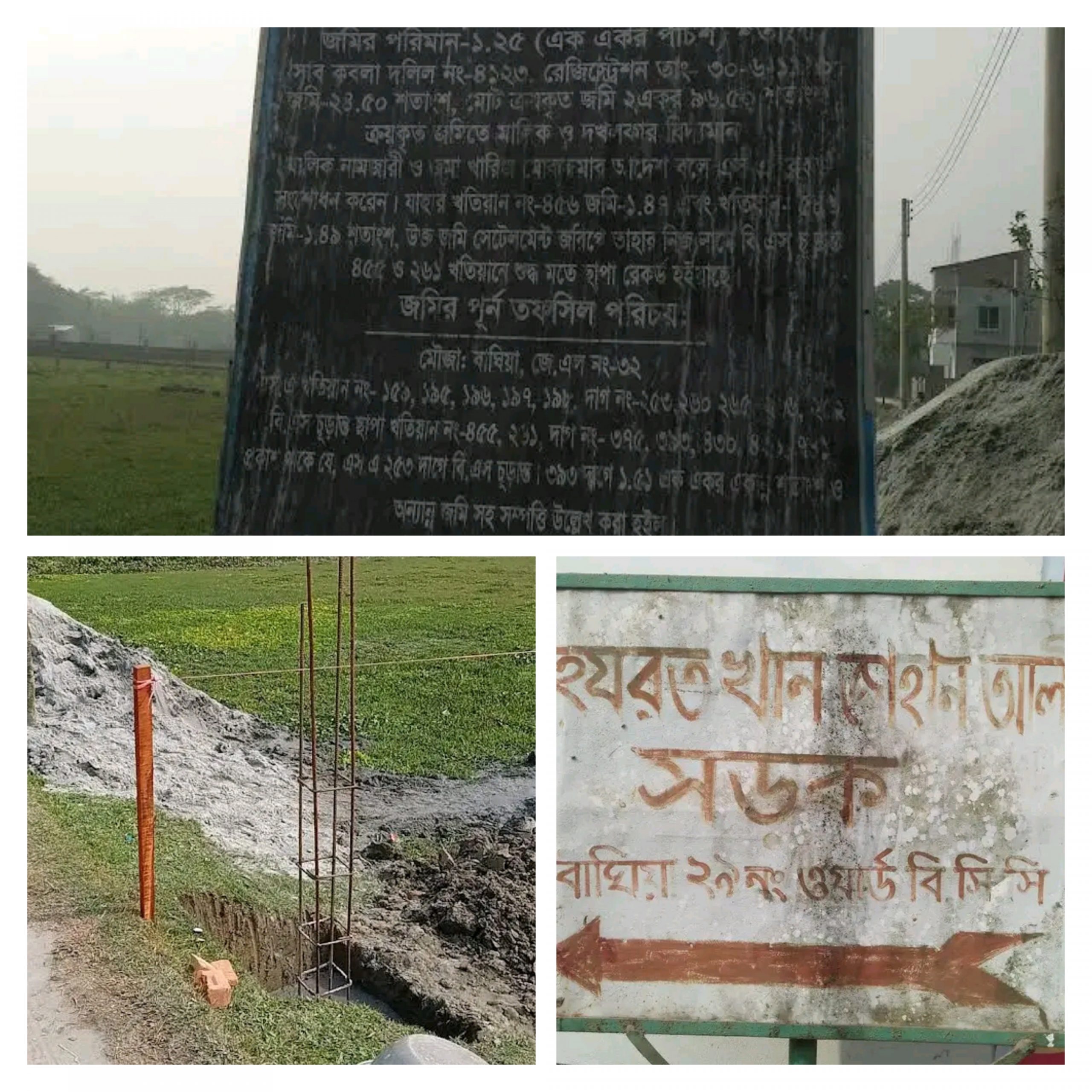 নগরীর ২৯ নং ওয়ার্ডের হযরত খানজাহান আলী সড়ক প্রবেশদ্বারে (সরেজমিনে) যাওয়া মাত্রই ছাত্রলীগ নেতা শাওন ভূমিদস্যু মোতালেব কে মামা পরিচয় দেয়। তাই তিনি স্থাপনা নির্মাণাধীন শ্রমিকদের কার্যক্রম পরিচালনা করছেন। কয়েক মিনিটের মধ্যে ঘটনাস্থলে উপস্থিত হয় ভূমিদস্যু মোতালেব ও আঞ্চলিক পত্রিকার দু’কথিত ফটোগ্রাফার। রাস্তার পাশে থাকা একটি সাইনবোর্ডে দেখা যায়, ক্রয়সূত্রে এই জমির মালিক কাজী সফিকুল ইসলাম। তাতে রয়েছে দলিল নং ও জমির দাগ খতিয়ান নংসহ বিস্তারিত বর্ণনা। জমির পরিমান (১.২৫ একর)।