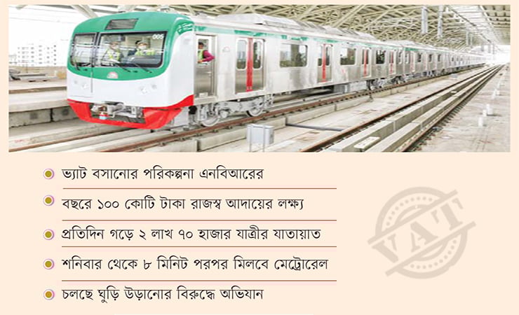 তিনি আরও বলেন,মেট্রোরেল পরিষেবার ভ্যাট থেকে রাজস্ব বোর্ড বছরে প্রায় ১০০ কোটি টাকা রাজস্ব আদায় করতে পারবে।ওই এনবিআর কর্মকর্তা জানান,আইন অনুযায়ী,এসি ও নন-এসি উভয় ধরনের রেলওয়ে পরিষেবার জন্য ১৫ শতাংশ ভ্যাট প্রযোজ্যমূল্য সংযোজন কর ও সম্পূরক শুল্ক আইন ২০১২-এর ধারা ২৬-এ শীতাতপ-নিয়ন্ত্রিত (এসি) ও প্রথম-শ্রেণির নন-এসি রেল পরিষেবা কোনোটিতেই যাত্রী পরিবহনের জন্য ভ্যাট ছাড় দেওয়া হয়নি।