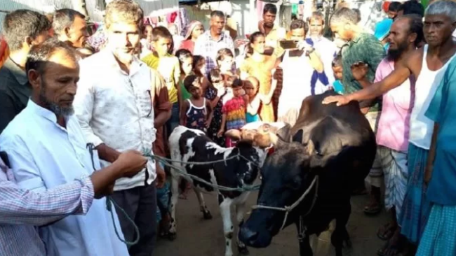 এখবর এলাকায় ছড়িয়ে পড়লে স্থানীয় ৩জন ইউপি সদস্য ও এলাকার গণ্যমান্য ব্যক্তিদের উপস্থিতিতে গ্রাম্য শালিসের মাধ্যমে ওইদিন পুনরায় দুধের গাভী ও বকনার মূল্য ১ লক্ষ টাকা নির্ধারণ করে গরু দুটি বরের বাবার হাতে তুলে দেন। তবেই বিয়ের আনুষ্ঠানিকতার অনুমতি দেন যৌতুক লোভী ওই নাজিম উদ্দিন।
