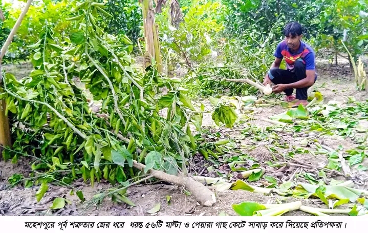 মহেশপুর (ঝিনাইদহ) প্রতিনিধি।।জমি-জমা নিয়ে বিরোধে ও আদালতে মামলার কারনে মাঠের মাল্টা গাছ ও পেয়ারাগাছ কেটে দেওয়া হয়েছে। এমন ঘটনা ঘটেছে ঝিনাইদহের মহেশপুর উপজেলার হামিদপুর মৌজার হুদোর মাঠে।