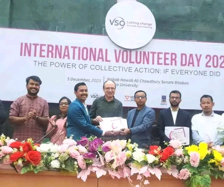গতকাল ঢাকা বিশ্ববিদ্যালয়ের নবাব নওয়াব আলী সিনেট ভবনে আয়োজিত আন্তর্জাতিক স্বেচ্ছাসেবী দিবসের কর্মসূচি শেষে শালিণ্য সম্পাদক কিশোর চন্দ্র বালা,সেক্রেটারিয়ের মেম্বার মৌসুমী শর্মা ও নির্বাহী সদস্য আখতার হোসেনের হাতে সম্মাননা স্মারক ও সনদ তুলেদেন ভিএসও কর্তৃপক্ষ।