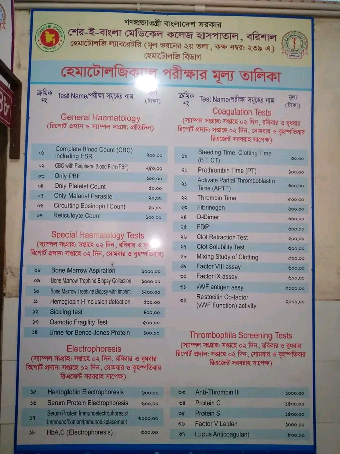 বরিশাল প্রতিনিধি:গণপ্রজাতন্ত্রী বাংলাদেশ সরকারের অধীন শের-ই-বাংলা মেডিকেল কলেজ হাসপাতাল,বরিশালের হেমাটোলজি বিভাগে বিভিন্ন হেমাটোলজিক্যাল পরীক্ষার সরকারি মূল্য তালিকা প্রকাশ করা হয়েছে।হাসপাতালের মূল ভবনের দ্বিতীয় তলায় অবস্থিত হেমাটোলজি ল্যাবরেটরি (কক্ষ নম্বর–২৩৯) থেকে এই পরীক্ষাগুলো পরিচালনা করা হচ্ছে।