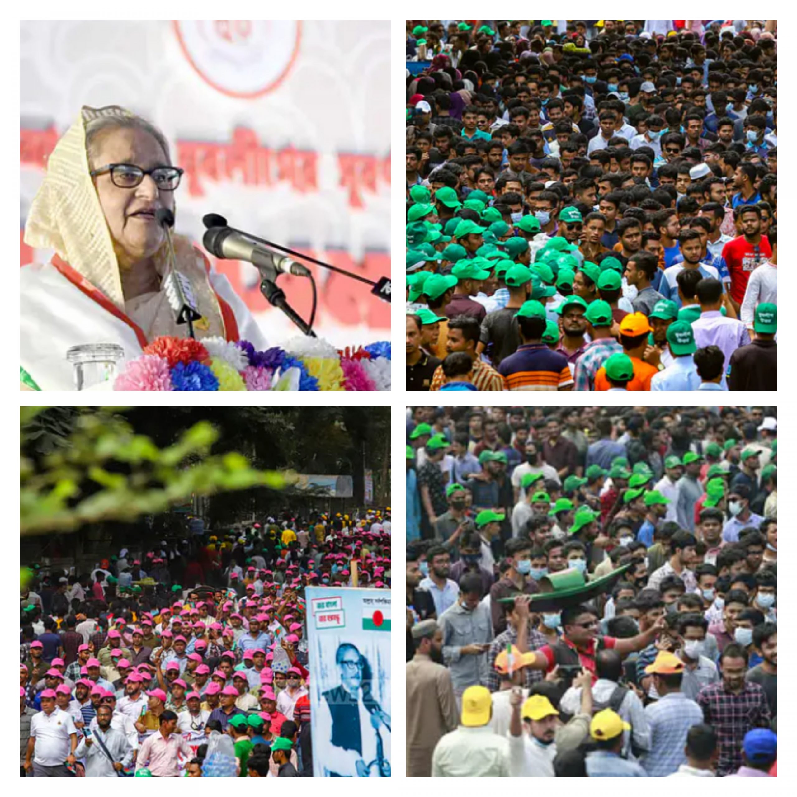 এর অনেক আগে সকাল ৯টা থেকেই যুব নেতাকর্মীরা ঢাকার বিভিন্ন এলাকা থেকে নানা রঙের টিশার্ট পরে, ক্যাপ মাথায়, প্ল্যাকার্ড হাতে বাদ্যবাজনা বাজিয়ে সমাবেশ স্থলে আসতে শুরু করেন।