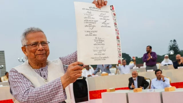 শুক্রবার বিকেলে জাতীয় সংসদ ভবনের দক্ষিণ প্লাজায় অনুষ্ঠানের মাধ্যমে জুলাই জাতীয় সনদ ২০২৫–এ স্বাক্ষর করেন জাতীয় ঐকমত্য কমিশনের সভাপতি প্রধান উপদেষ্টা অধ্যাপক মুহাম্মদ ইউনূস,কমিশনের অন্যান্য সদস্য এবং ২৪টি রাজনৈতিক দলের নেতারা। সংস্কারের লক্ষ্যে দীর্ঘ আলোচনার মধ্য দিয়ে প্রণীত এই জুলাই জাতীয় সনদ হুবহু নিচে তুলে ধরা হলো—