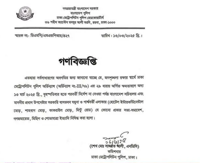 নিজস্ব প্রতিবেদক।।পরবর্তী নির্দেশ না দেওয়া পর্যন্ত বাংলাদেশ সচিবালয় এবং প্রধান উপদেষ্টার সরকারি বাসভবন যমুনা ও পার্শ্ববর্তী এলাকায় সব ধরনের সভা-সমাবেশ,গণজমায়েত-মিছিল ও শোভাযাত্রা নিষিদ্ধ করেছে ঢাকা মহানগর (ডিএমপি) পুলিশ।