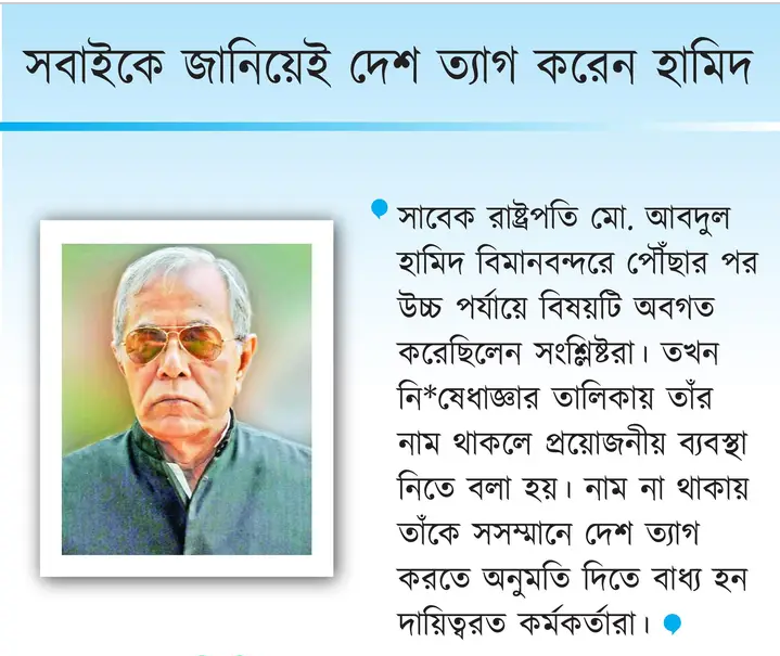 নাম প্রকাশে অনিচ্ছুক একজন গোয়েন্দা কর্মকর্তা বলেন, সাবেক রাষ্ট্রপতি মো. আবদুল হামিদ বিমানবন্দরে পৌঁছার পর উচ্চ পর্যায়ে বিষয়টি অবগত করেছিলেন সংশ্লিষ্টরা।তখন নিষেধাজ্ঞার তালিকায় তাঁর নাম থাকলে প্রয়োজনীয় ব্যবস্থা নিতে বলা হয়।নাম না থাকায় তাঁকে সসম্মানে দেশ ত্যাগ করতে অনুমতি দিতে বাধ্য হন দায়িত্বরত কর্মকর্তারা।এর বাইরে তিনি চতুর্থ স্টেজের ক্যানসার রোগী বলে অবগত করেছিলেন দায়িত্বরত কর্মকর্তাদের।