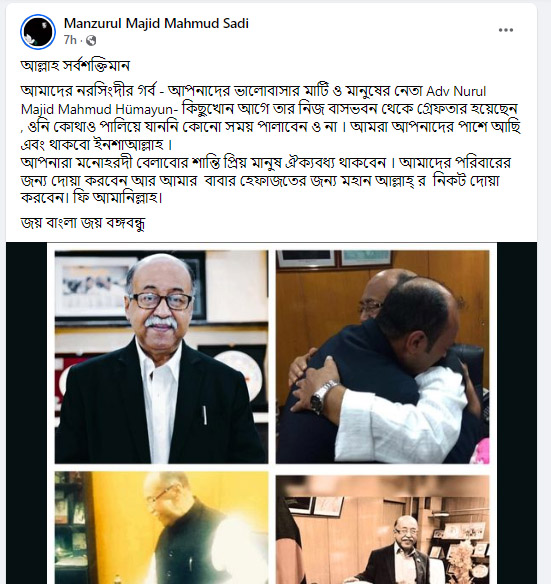 পোস্টে তিনি লিখেন, ‘আল্লাহ সর্বশক্তিমান,আমাদের নরসিংদীর গর্ব,আপনাদের ভালোবাসার মাটি ও মানুষের নেতা অ্যাডভোকটে নুরুল মজিদ মাহমুদ হুমায়ুন কিছুক্ষণ আগে তার নিজ বাসভবন থেকে গ্রেপ্তার হয়েছেন।তিনি কোথাও পালিয়ে যাননি,কোনো সময় পালাবেনও না।আমরা আপনাদের পাশে আছি এবং থাকব ইনশাআল্লাহ।’