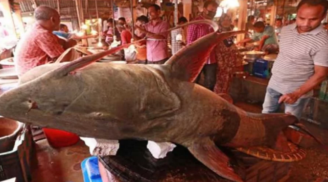 ফেঞ্চুগঞ্জ(সিলেট)প্রতিনিধি।।ফেঞ্চুগঞ্জের কুশিয়ারা নদীতে মাছটি ধরা পড়ে সোমবার রাতে। মঙ্গলবার সকালে বিক্রির জন্য লালবাজারে নিয়ে আসেন মৎস্য ব্যবসায়ী বিলাল মিয়া। তবে মঙ্গলবার মাছটি বিক্রি না করে বুধবার কেটে ২ হাজার টাকা কেজি ধরে বিক্রি করবেন বলে জানিয়েছেন বিলাল। সিলেট নগরীর অন্যতম মাছের বাজার লালবাজারে উঠেছে ১৫০ কেজি ওজনের একটি বাঘাইড় মাছ।