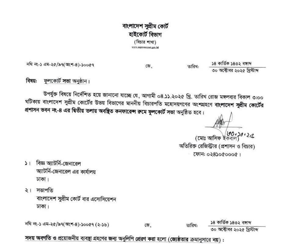 হাইকোর্ট বিভাগের অতিরিক্ত রেজিস্ট্রার (প্রশাসন ও বিচার) মো. আসিফ ইকবালের গত ৩০ অক্টোবর সই করা স্মারকে এ তথ্য জানানো হয়েছে।মঙ্গলবার বেলা তিনটায় কোর্টের প্রশাসন ভবনের (ভবন নং-৪) দ্বিতীয় তলায় কনফারেন্স রুমে ফুল কোর্ট সভা অনুষ্ঠিত হবে।