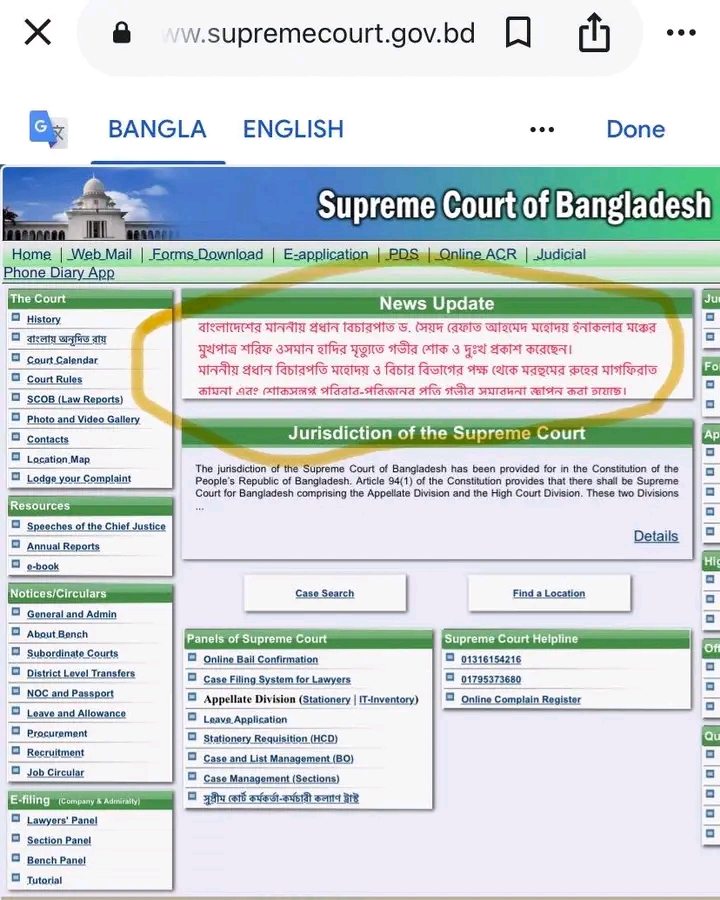 ডেস্ক রিপোর্ট।।হাদী হত্যাকাণ্ডে সুপ্রিম কোর্টের অফিসিয়াল ওয়েবসাইটে প্রকাশিত দুঃখপ্রকাশকে কেন্দ্র করে দেশজুড়ে শুরু হয়েছে তীব্র বিতর্ক।বিচার বিভাগের সাংবিধানিক ভূমিকা,নিরপেক্ষতা ও প্রাতিষ্ঠানিক সীমা অতিক্রম করা হয়েছে কি না—এই প্রশ্ন এখন আইন ও রাজনীতির কেন্দ্রবিন্দুতে।