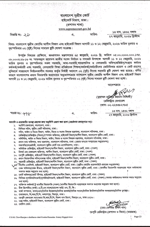 সূত্র: বাংলাদেশ সুপ্রীম কোর্ট (হাইকোর্ট ও আপীল বিভাগ), বিজ্ঞপ্তি নং- ২৯, ২৭ জানুয়ারি ২০২৬।