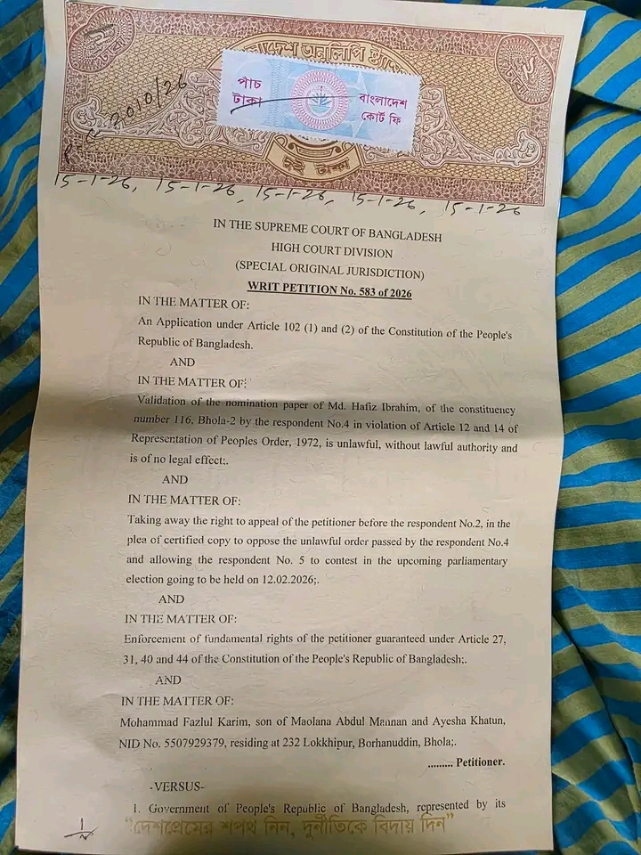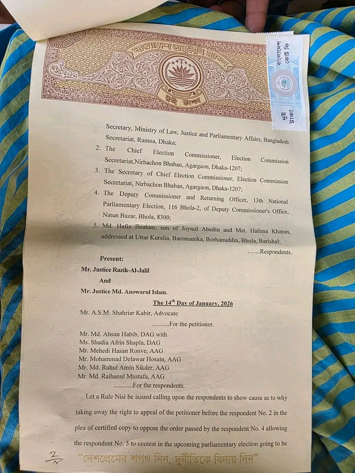 নিজস্ব প্রতিবেদক।।বাংলাদেশ সুপ্রীম কোর্ট,হাইকোর্ট ডিভিশনের বিশেষ মূল অধিকার সংক্রান্ত বিভাগ ভোলা-২ আসনের প্রার্থী মোঃ হাফিজ ইব্রাহিমের নির্বাচনী আপিল গ্রহণ ও প্রযোজ্য পদক্ষেপ গ্রহণের নির্দেশ দিয়েছে।