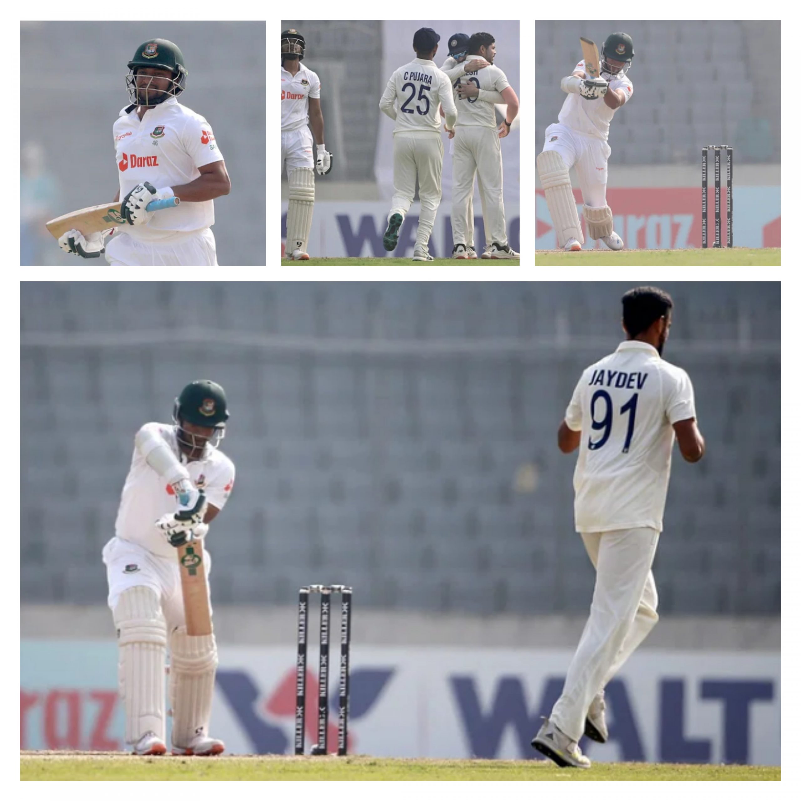 আজ বাংলাদেশ দল দ্বিতীয় ইনিংসে যখন ২৬ রান তুলতেই ২ উইকেট হারিয়ে ধুঁকছে,তখন ক্রিজে আসেন সাকিব। বাংলাদেশ ভারতের প্রথম ইনিংস স্কোর থেকে ৬১ রান দূরে। কিন্তু সাকিব সেই দূরত্ব পাড়ি দেওয়ারও ধৈর্য ধরলেন না।১৩ রান করেই জয়দেব উনাদকাটের বলে কাভারে উড়িয়ে মারতে গিয়ে আউট।প্রথম ইনিংসের মতো বিস্ময়ের জন্ম দিয়েছে সাকিবের এই আউটটিও।