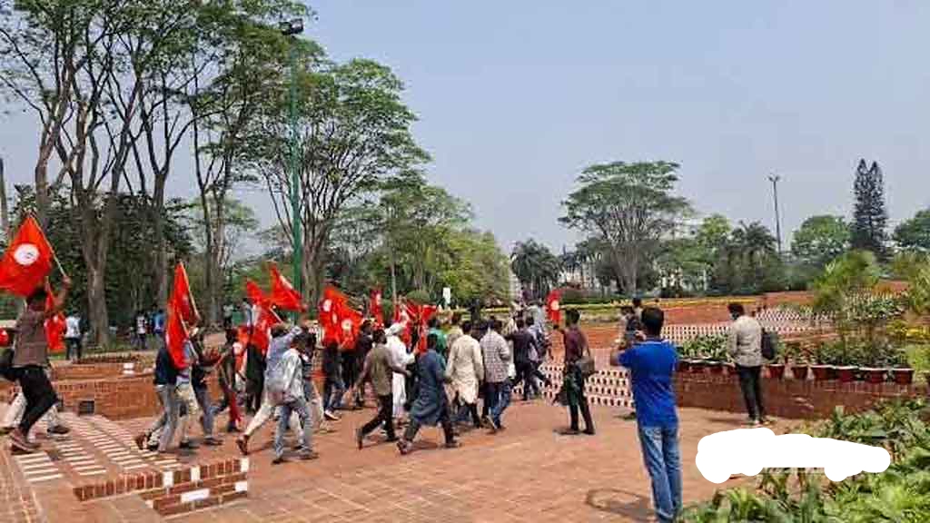 এদিন বেলা সোয়া ১১টার দিকে প্রায় ৩০ জনের একটি দল শহীদ বেদীতে শ্রদ্ধা জানিয়ে লাল পতাকা হাতে ফিরছিলেন। এ সময় তারা ‘জয় বাংলা, জয় বঙ্গবন্ধু’, ‘৭১ এর হাতিয়ার গর্জে উঠু আরেকবার’, ‘তুমি কে আমি কে বাঙালি বাঙালি’- ইত্যাদি স্লোগান দেন।
