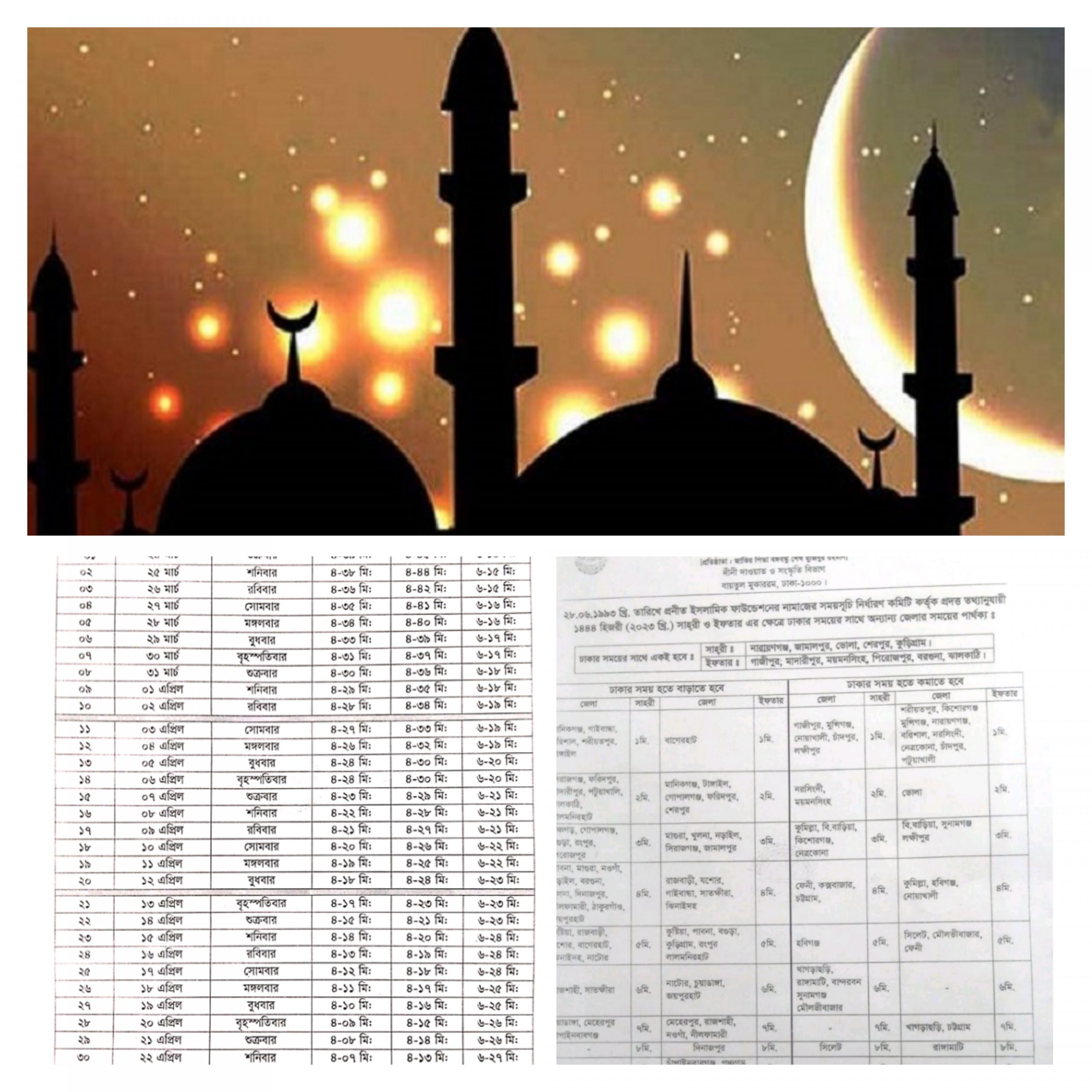 তবে প্রকাশিত সময়সূচির সঙ্গে দূরত্ব অনুযায়ী ঢাকার সময়ের সঙ্গে সর্বোচ্চ ৯ মিনিট পর্যন্ত যোগ করে ও ৯ মিনিট পর্যন্ত বিয়োগ করে অন্যান্য জেলার সাহরি ও ইফতারের সময় নির্ধারণের সংক্ষিপ্ত নির্দেশনাও যুক্ত করে দেয়া হয়েছে।