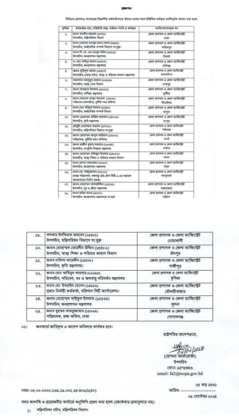 মন্ত্রিপরিষদ বিভাগের উপসচিব তানভীর আহমেদকে ঢাকা, অর্থনৈতিক সম্পর্ক বিভাগের সংযুক্ত উপসচিব মোহাম্মদ কামরুল হাসান মোল্লাকে ফরিদপুর,জনপ্রশাসন মন্ত্রণালয়ের উপসচিব পিকেএম এনামুল কবিরকে সিলেট,জনপ্রশাসন মন্ত্রণালয়ের উপসচিব ড. মো. ফরিদুর রহমানকে হবিগঞ্জ, স্বাস্থ্য ও পরিবার কল্যাণ মন্ত্রণালয়ের উপদেষ্টার একান্ত সচিব মুফিদুল আলমকে ময়মনসিংহ,স্বাস্ত্যসেবা বিভাগের উপসচিব তরফদার মাহমুদুর রহমানকে শেরপুর,বাণিজ্য মন্ত্রণালয়ের উপসিচব ফারহানা ইসলামকে কুষ্টিয়া,দুর্নীতি দমন কমিশনের পরিচালক (উপসচিব) মোহাম্মদ আব্দুল আওয়ালকে ঝিনাইদহ,অর্থনৈতিক সম্পর্ক বিভাগের উপসচিব মো. অহিদুল ইসলামকে মাগুরার ডিসি করা হয়েছে।