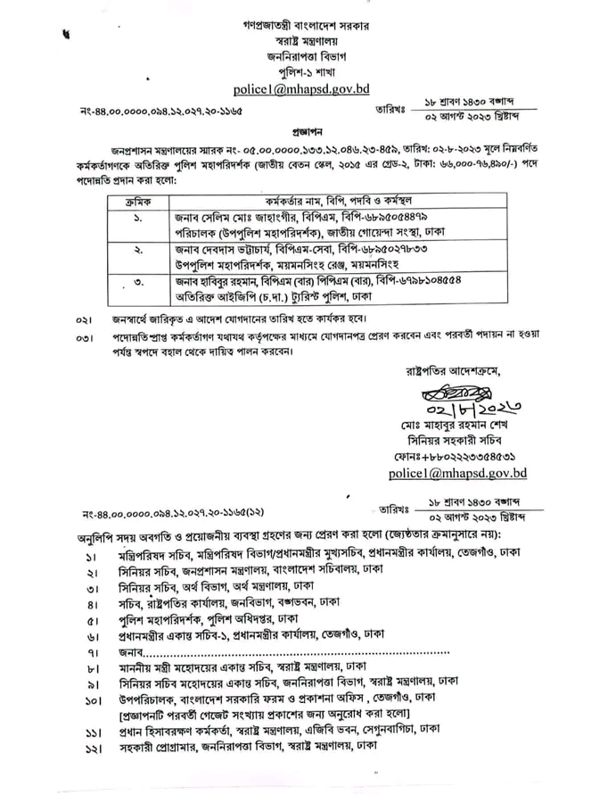 বুধবার স্বরাষ্ট্র মন্ত্রণালয় থেকে অতিরিক্ত উপমহাপরিদর্শক (ডিআইজি) থেকে গ্রেড-২ এ পদোন্নতি দিয়ে তাদের অতিরিক্ত আইজি করার প্রজ্ঞাপন হয়।