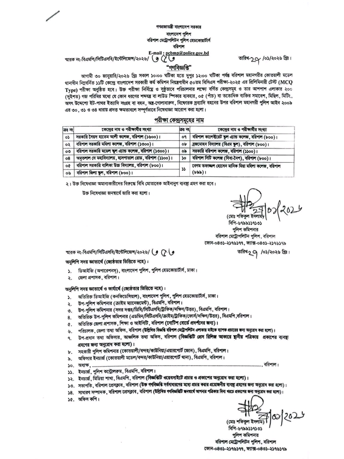 গণবিজ্ঞপ্তিতে স্বাক্ষর করেন বরিশাল মেট্রোপলিটন পুলিশের পুলিশ কমিশনার মো. শফিকুল ইসলাম।