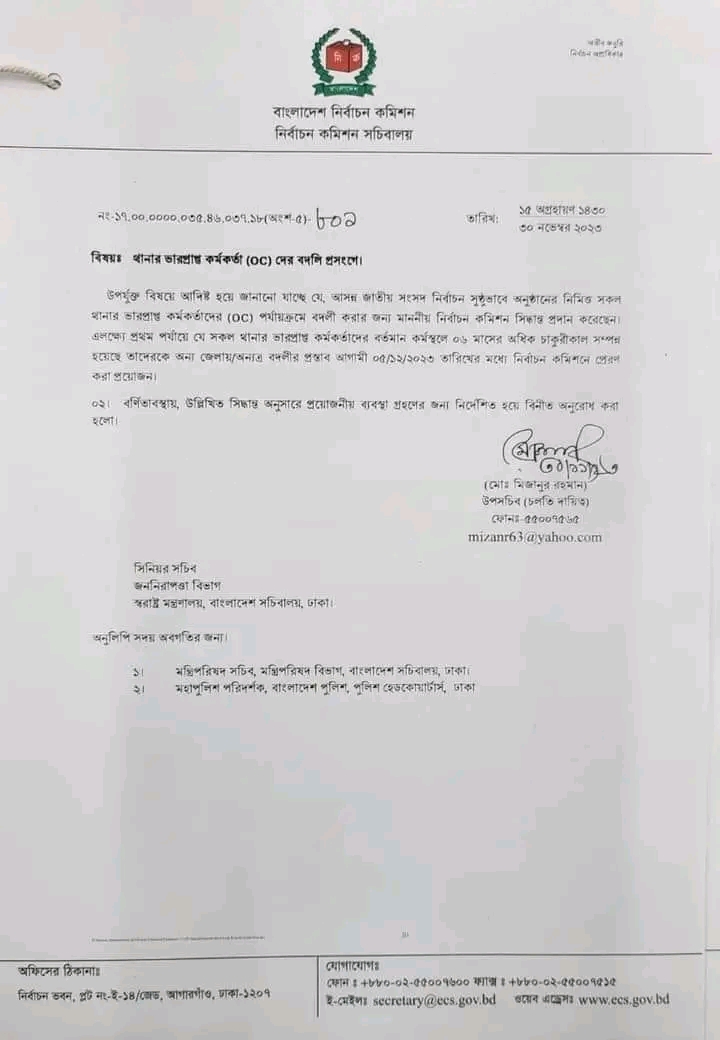 বৃহস্পতিবার জনপ্রশাসন সচিব,জননিরাপত্তা বিভাগ সচিব, আইজিপির সঙ্গে ইসির বৈঠক হয়।এরপর স্বরাষ্ট্র মন্ত্রণালয়ে পাঠানো চিঠিতে বলা হয়, “আসন্ন জাতীয় সংসদ নির্বাচন সুষ্ঠুভাবে অনুষ্ঠানের নিমিত্ত সকল থানার ভারপ্রাপ্ত কর্মকর্তাদের (OC) পর্যায়ক্রমে বদলি করার জন্য মাননীয় নির্বাচন কমিশন সিদ্ধান্ত প্রদান করেছেন।