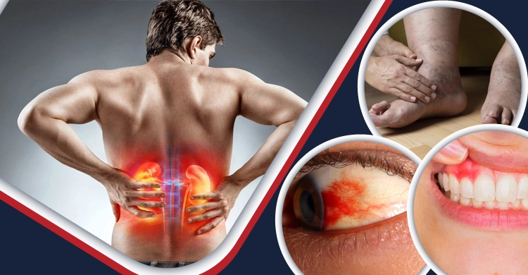 এর উপসর্গগুলোর মধ্যে আছে-প্রস্রাবে প্রোটিন,বারবার প্রস্রাবের বেগ,রক্তচাপ নিয়ন্ত্রণের অবনতি,পা,গোড়ালি,হাত ও চোখ ফুলে যাওয়া,বমি বমি ভাব,বমি,ক্লান্তি’সহ অনেক কিছু।
