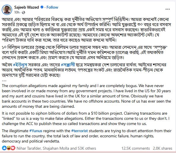পোস্টে সজীব ওয়াজেদ জয় লেখেন,আমার এবং আমার পরিবারের বিরুদ্ধে করা দুর্নীতির অভিযোগ সম্পূর্ণ ভিত্তিহীন। আমরা কখনোই কোনো সরকারি প্রকল্পে জড়িত ছিলাম না বা এর থেকে অর্থ উপার্জন করিনি।আমি যুক্তরাষ্ট্রে ৩০ বছর ধরে বসবাস করছি এবং আমার খালা ও কাজিনরা যুক্তরাজ্যে প্রায় একই সময় ধরে বসবাস করছেন।